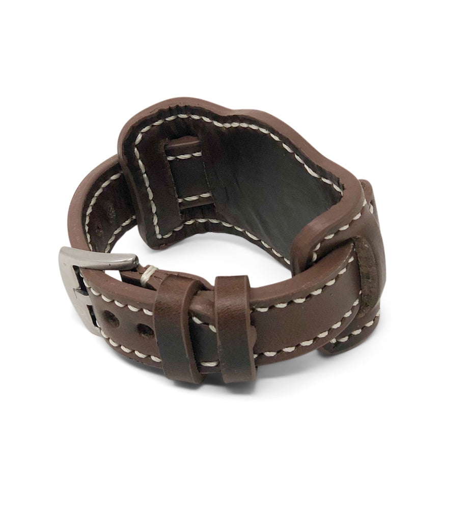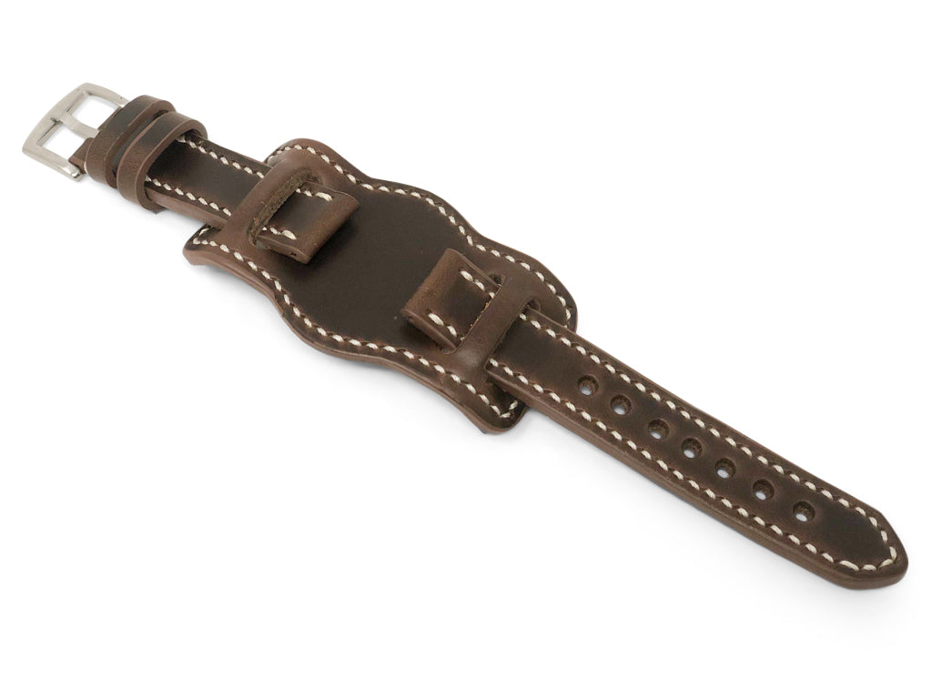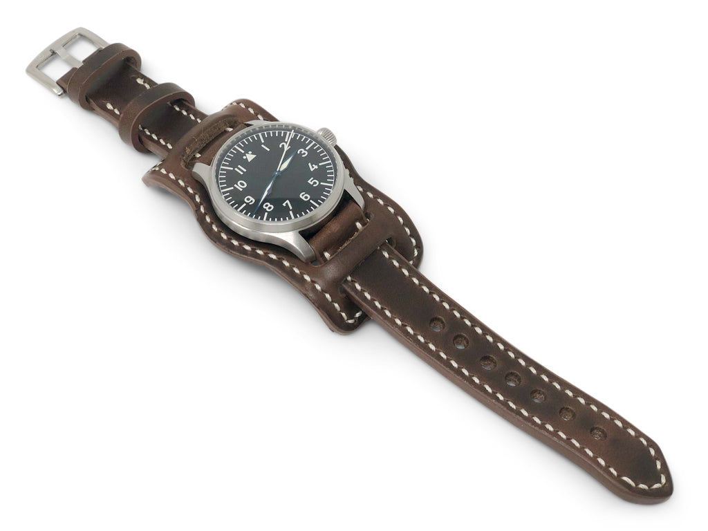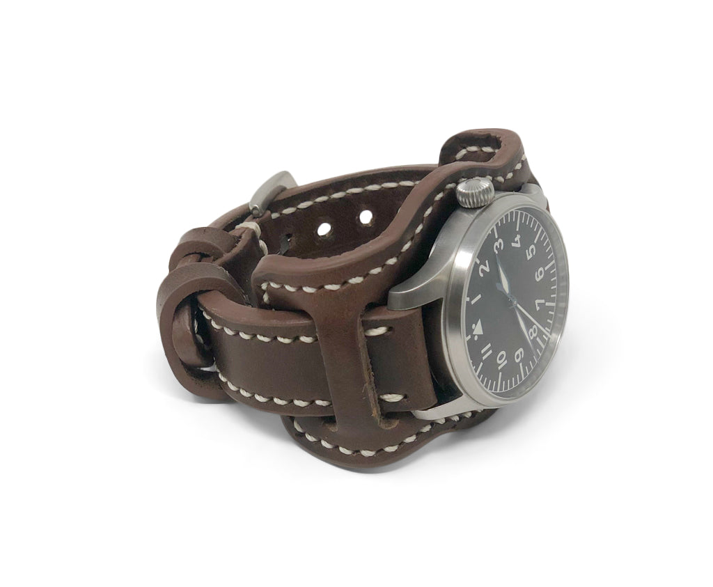 The aviator bund is a classic look elevated with premium Horween Chromexcel leather. This pad portion of the strap is lined with a thin supple layer of leather and stitched for extra comfort. The strap is around 4mm thick. Pad dimensions are 50mm width x 100mm length
